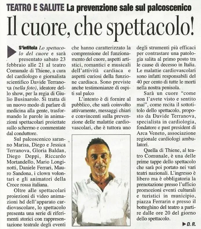 Lo Spettacolo del Cuore è uno spettacolo teatrale multimediale a carattere scientifico e divulgativo, adatto a tutti, che propone la conoscenza del cuore in un’ottica di prevenzione delle malattie cardiovascolari ed utilizza le tecniche dello spettacolo per far comprendere cos’è, come funziona e come farlo stare bene; permette agli spettatori di conoscere con chiarezza, semplicità e praticità la natura delle comuni malattie cardiovascolari e soprattutto come prevenirle, attuando suggerimenti di corretta alimentazione.